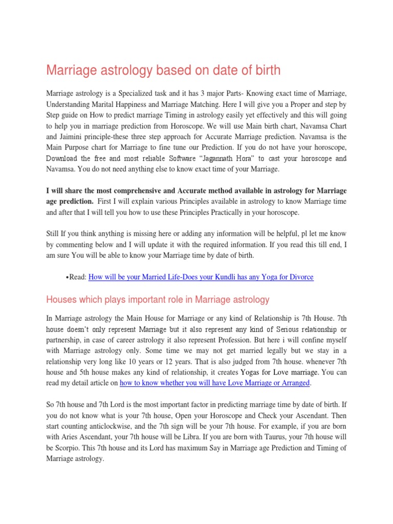 Marriage Prediction By Date Of Birth - Saraswati Jyotish Kendra Our marriage time astrology can help you predict how your marriage will turn out. You will help you to decide the best time and age for marriage. Our prediction by birth date can provide satisfying answers to your questions about marriage, such as: Do I want to arrange marriage? What is the future of my marriage? My marriage is getting delayed.